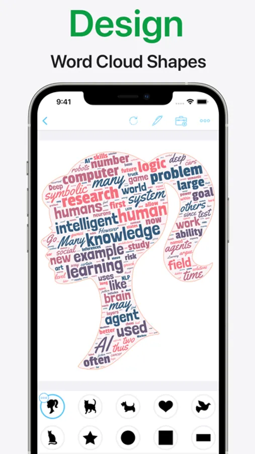 • Need to brainstorm on a document and need a quick way to highlight the words that matter most? Shapego can help you by making a word cloud with only the most recurrent words thanks to iOS state-of-the-art Natural Language Processing technologies.