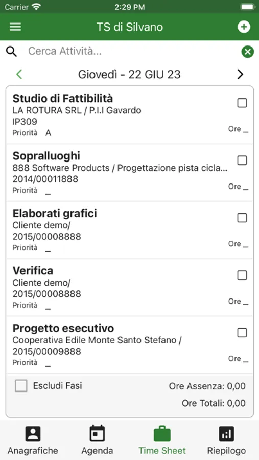 Oltre a consultare clienti/fornitori/prospect e a gestire i tuoi appuntamenti e le attività da fare, ora puoi rendicontare da fuori ufficio le ore lavorate nelle attività dei singoli progetti.