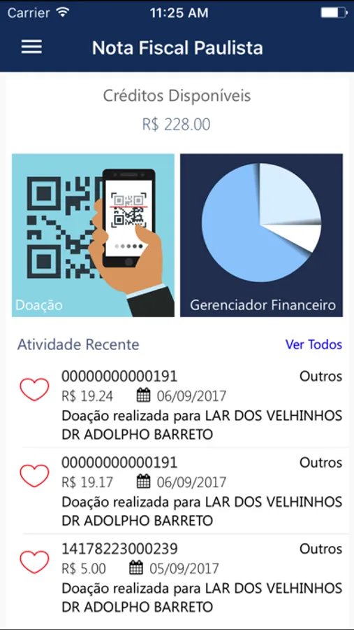 Com o Aplicativo oficial da Nota Fiscal Paulista você acompanha o saldo dos seus créditos, solicita transferências para sua conta bancária e faz a doação de documento fiscal para sua entidade favorita, de forma fácil e rápida. Em breve, disponibilizaremos todas as funcionalidades do Programa.