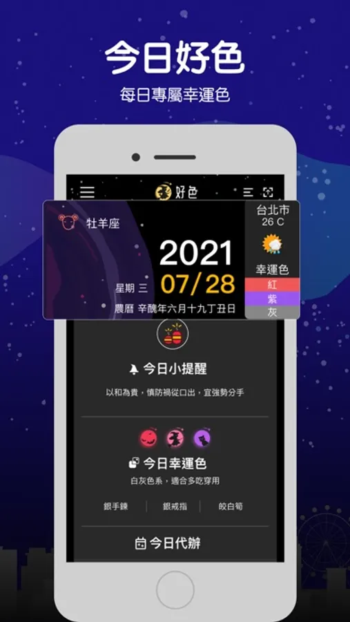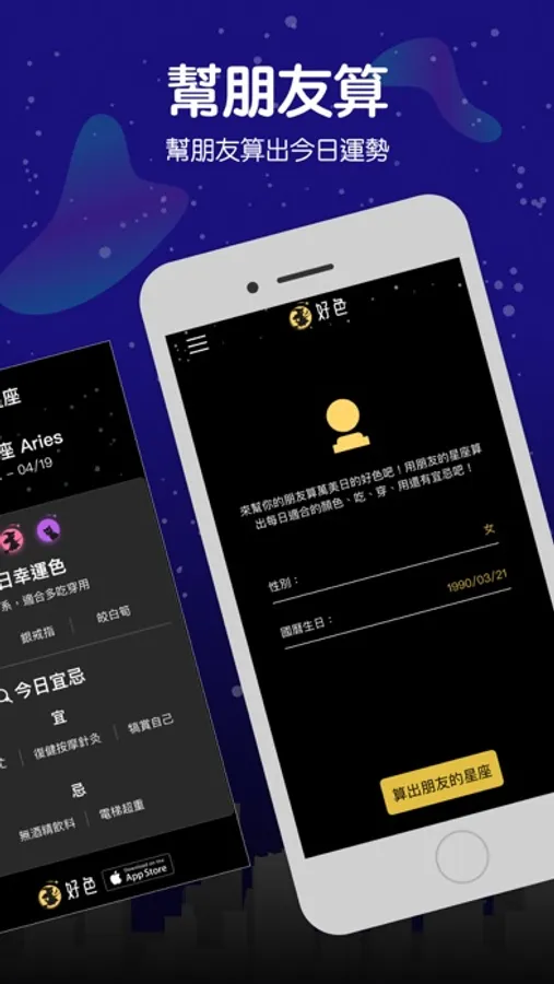 好色擺脫複雜難懂的星盤、命盤解釋,只需要輸入出生年月日對應的星座及性別,就能輕鬆得知每日幸運色、每日宜忌相關建議,並用最直白易懂的文字說明,人生雖難但也可以過的幽默有趣。