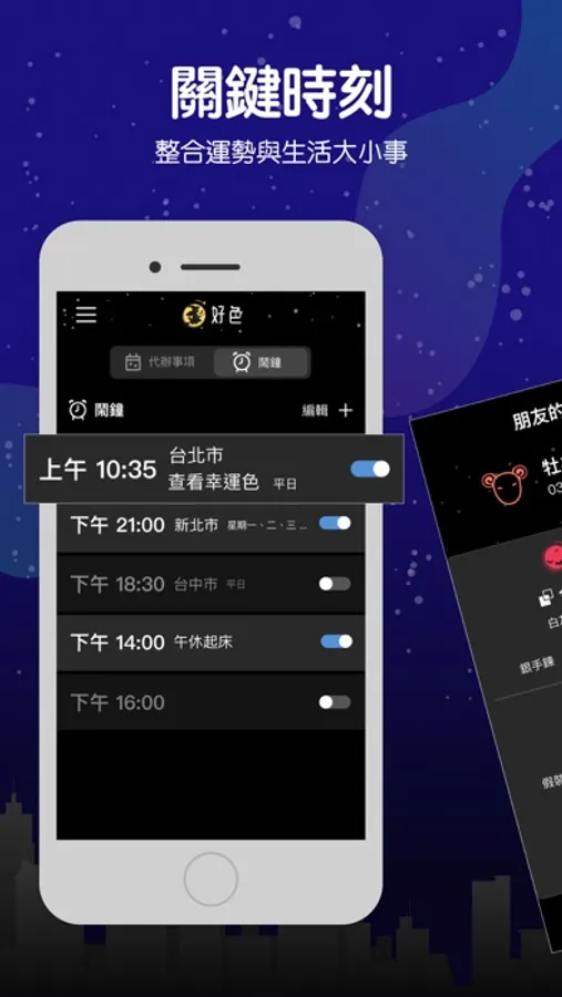 -關鍵時刻:整合運勢及生活大小事,客製行事曆服務,透過待辦事項、鬧鐘功能,讓你成功擺脫雜亂的工作行程,有效查看每日時間規劃,重拾零碎時光