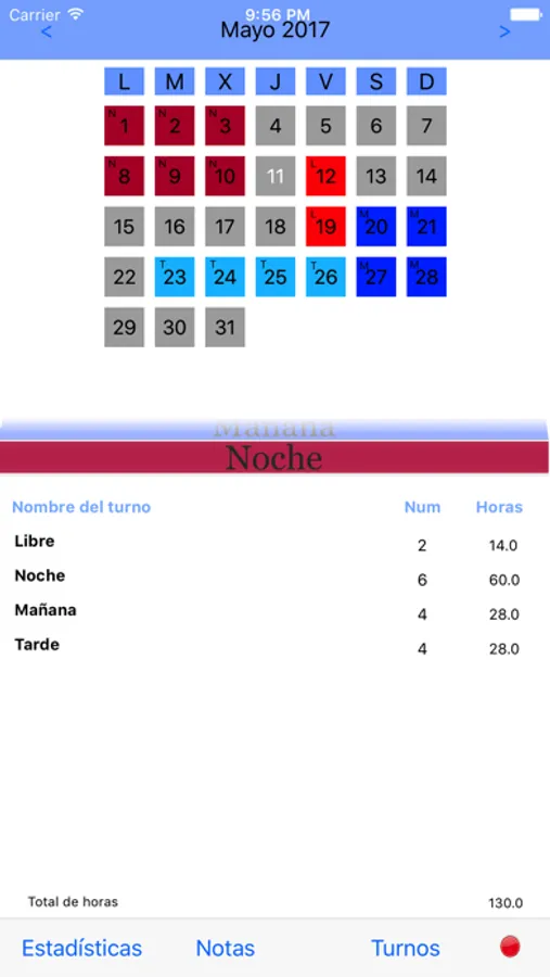 Añade, modifica y elimina los turnos que sean necesarios. Márcalos en el calendario para saber de un solo vistazo los turnos que tienes cada mes.