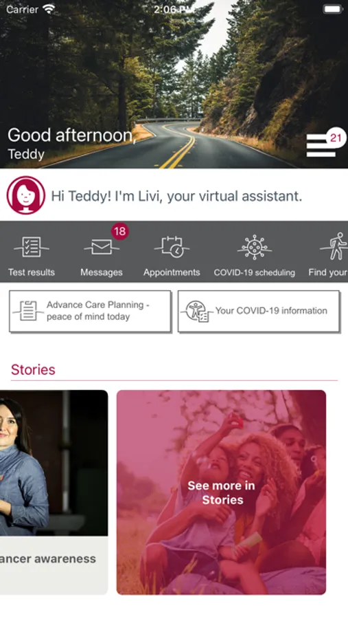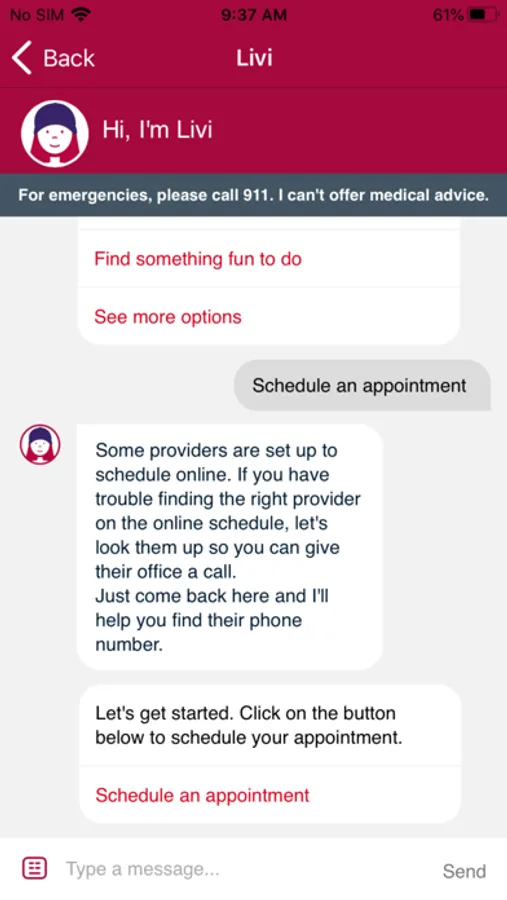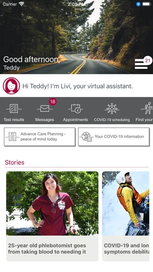 Ask Livi, our UCHealth virtual assistant, to help you out with any task listed above. Ask her things like, “show my test results," "when is my appointment?" or "get me information on Virtual Visits."