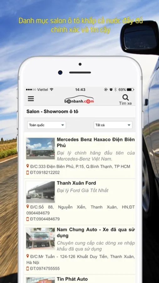 Bon banh hiện có hơn 700 salon/ showroom ô tô mới và đã qua sử dụng trải khắp cả nước. Thông tin salon / showroom đều được xác minh đầy đủ và chính xác giúp bạn dễ dàng tìm kiếm và liên hệ