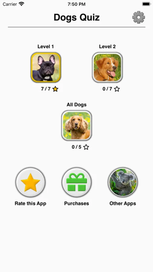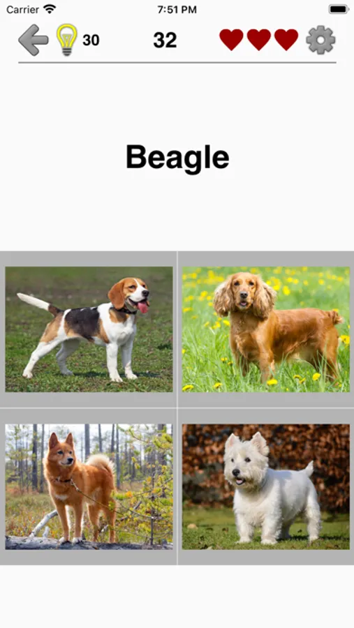 The game is divided into three levels according to the difficulty of the questions. Start with 100 well-known breeds, such as French Bulldog and German Shepherd, and proceed with 110 rare breeds such as Sussex Spaniel and Pharaoh Hound. The whole encyclopedia of dogs!