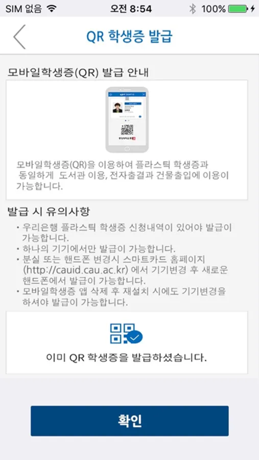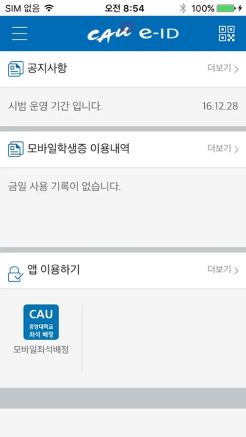 중앙대학교 평생교육원 모바일학생증 앱을 실행하여 QR코드를 바코드리더기, RF리더기(도서관 출입, 좌석배정기, 유인 대출)에 인식