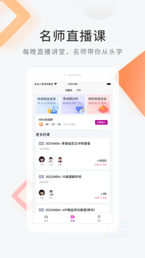 每晚名师现场直播,带你无忧过考试,考试资讯、考前准备、大纲解析、知识点详解、做卷练题、心态管理名师全程指导。
