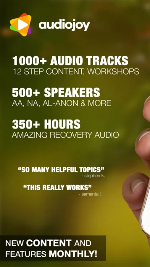 Audiojoy includes much more than just a few AA speakers and literature. You will find plenty of audio content for staying sober, getting clean and living a drug and alcohol free life. With over 500 AA, NA and Al-Anon speaker tapes, Big Book and Basic Text stories of recovery, daily reflections, living clean and sober. If you like what you hear you can unlock and download hundreds of hours of additional solution focused content from popular 12 step programs that will help you stop drinking, get relief from drugs and addiction, find the love you love and enjoy not drinking or using one day at a time.