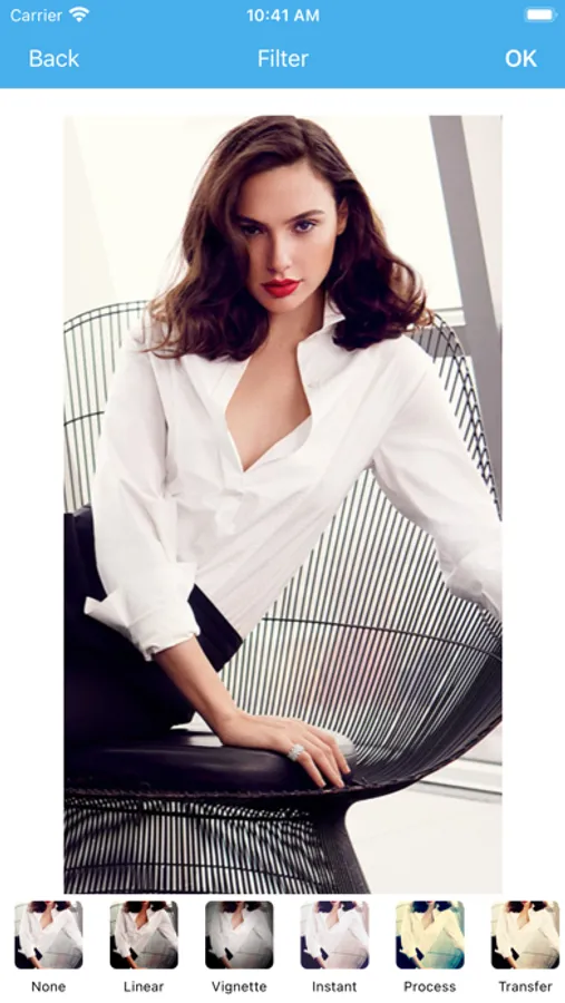 • Edit your photos using filters such as Normal, Linear, Vignette, Instant, Process, Transfer, Chrome, Fade, Curve, Tonal, Noir, Mono, Invert and more.