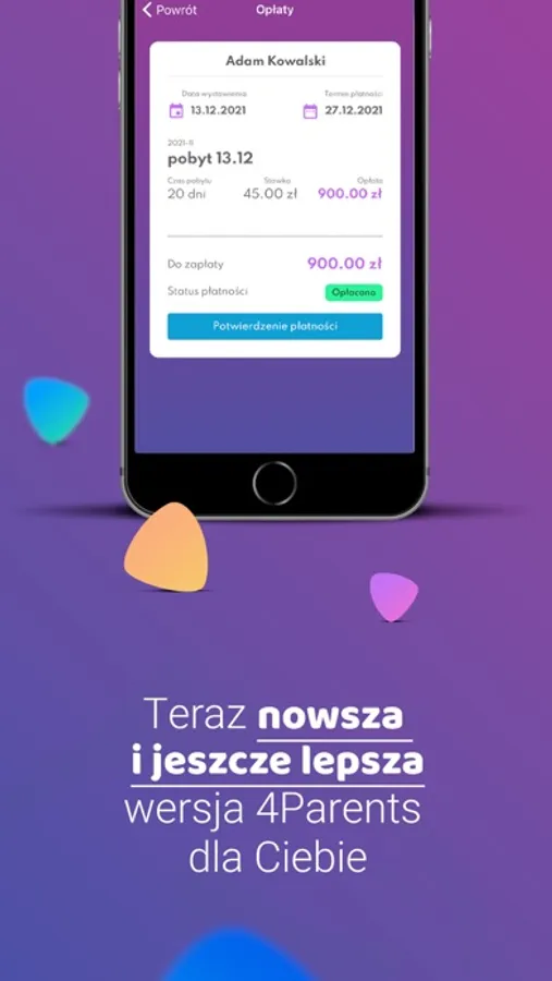 4parents.pl to aplikacja dedykowana rodzicom którzy chcą być w kontakcie z przedszkolem lub żłobkiem (korzystającym z Platformy 4Parents) do którego uczęszczają ich pociechy. Dzięki Aplikacji zawsze będziesz na bieżąco z ważnymi wydarzeniami, zgłosisz nieobecność bez konieczności dzwonienia do przedszkola lub żłobka, jednym kliknięciem uregulujesz wszystkie płatności a do tego otrzymasz dostęp do galerii zdjęć prowadzonej przez placówkę. Oczywiście to tylko niektóre funkcjonalności oferowane przez Aplikację. Pobierz i sam przekonaj się jak wiele masz możliwości z 4Parents. Życzymy miłego użytkowania.
