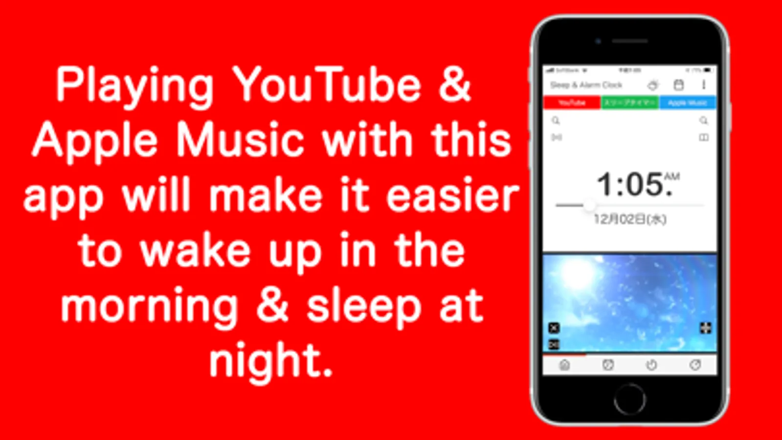 This is an alarm clock app that can use YouTube, Apple Music, and recorded audio as alarms and timers. It also supports fade-in and shuffle playback, so you can wake up comfortably with fresh music every day.