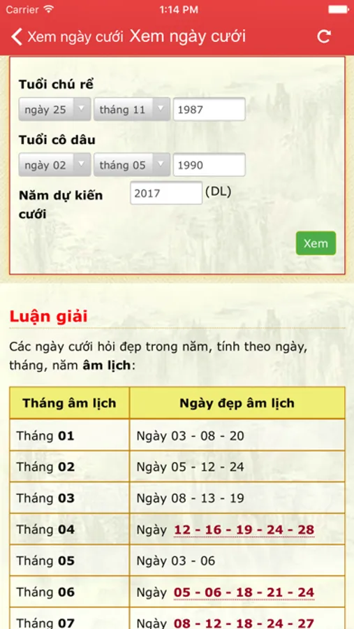 • Xem ngày cưới
