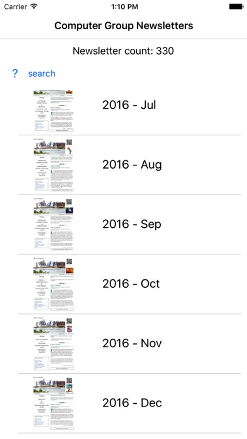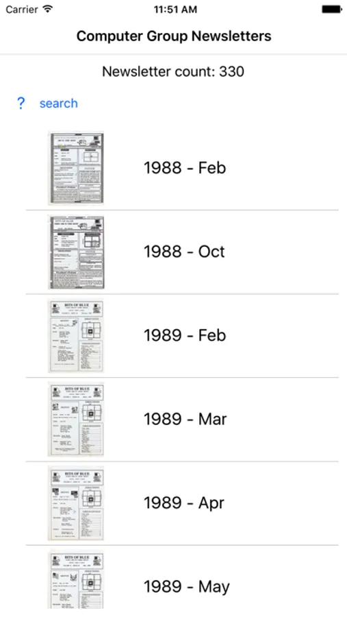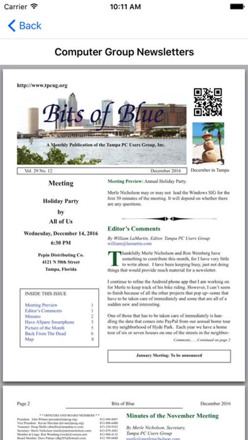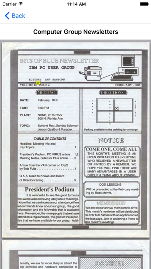 This app allows you read and search the monthly newsletters of the Tampa PC Users Group from 1988 through 2016. The Main Page consists of a scrollable collection of newsletter front pages. A tap on a front page will bring up that newsletter in a second page where you may scroll through it.
