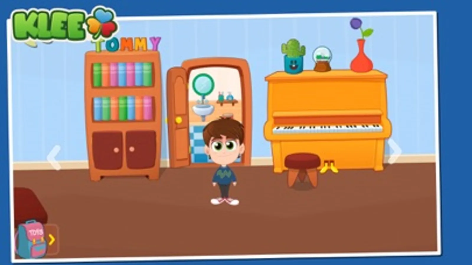 Explore Tommy’s house with him! Walk around the rooms, play with his toys, use and store his objects, and give him food and drinks.