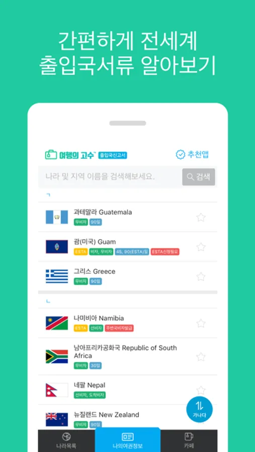 간편하게 나라를 검색하여 이용하실 수 있습니다. 편의 기능인 대륙별, ABC, ㄱㄴㄷ 정렬 기능을 제공합니다.