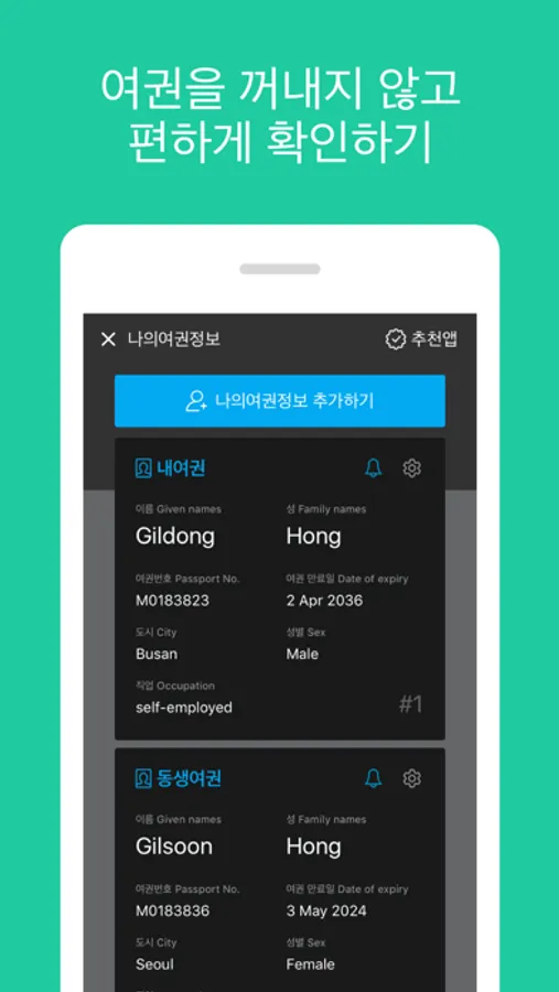 나의 여권 정보에서 여러 개의 여권 정보도 추가로 저장이 가능합니다! 이제 가족들의 여권 정보를 하나하나 볼 필요가 없습니다. 여행의 고수 앱을 통하면 하나에 모든 정보를 해결할 수 있습니다.