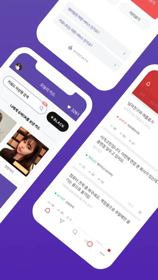 소개팅앱 기능과 익명 커뮤니티 기능이 따로 탑재되어 있어 원하는 기능만 이용할 수 있습니다.