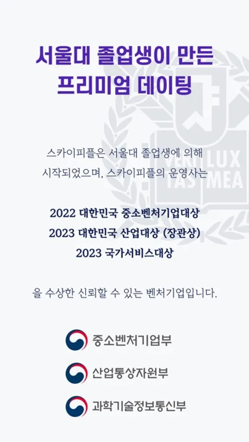 처음에는 솔로인 서울대생들이 좋은 인연을 찾을 수 있도록, 진실한 사람들끼리 모일 수 있는 공간을 만들자는 뜻으로 서울대학교 커뮤니티에서 시작했습니다. 그리고 현재는 20대와 30대, 40대 모두를 위한 "스카이피플" 서비스를 운영하고 있습니다.