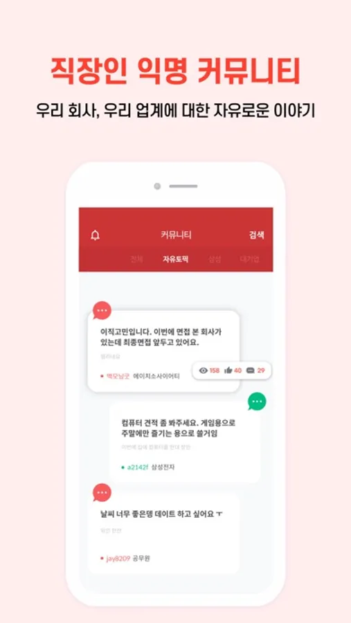 우리 회사 이야기, 우리 직군 이야기, 우리 업계 이야기 등을 자유롭게 익명으로 나눌 수 있습니다.