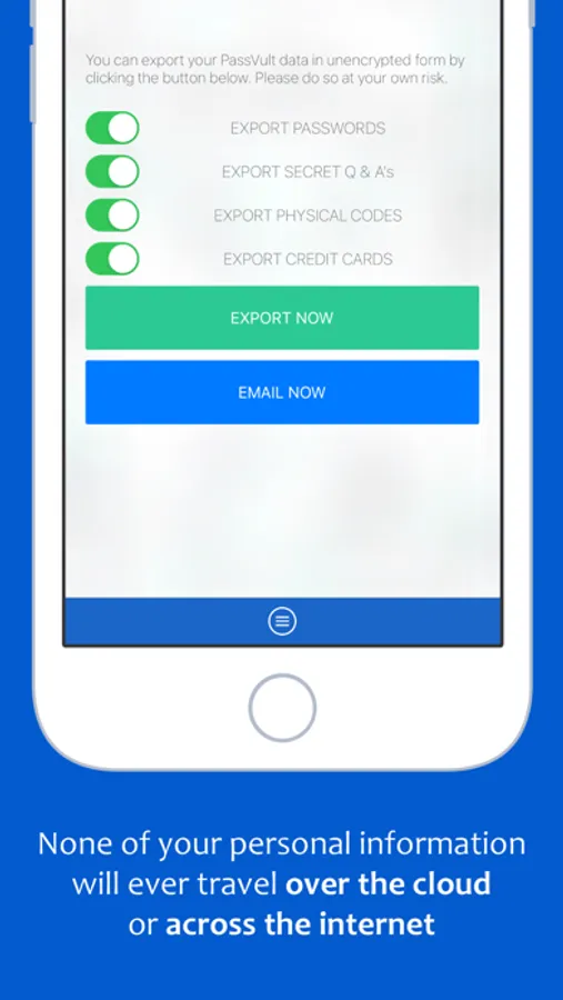 The PassVult app is the password storage app of choice for those who value security and privacy. All of your data remains localised on your device and will never transfer any of your personal information across the cloud or over the internet.
