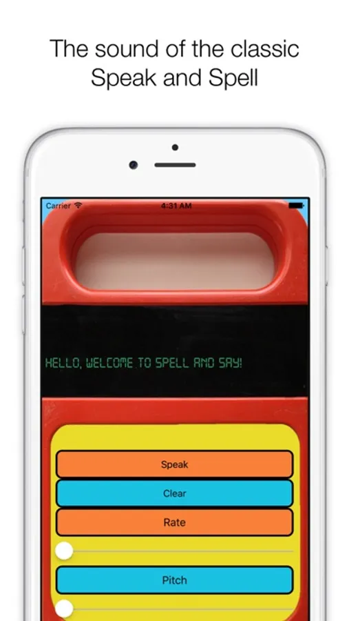 Just tap on the screen and a keyboard will appear to type what you want. When you are finished, touch speak. The Spell And Say also has sliders to adjust the pitch and speed to your liking. Enjoy!
