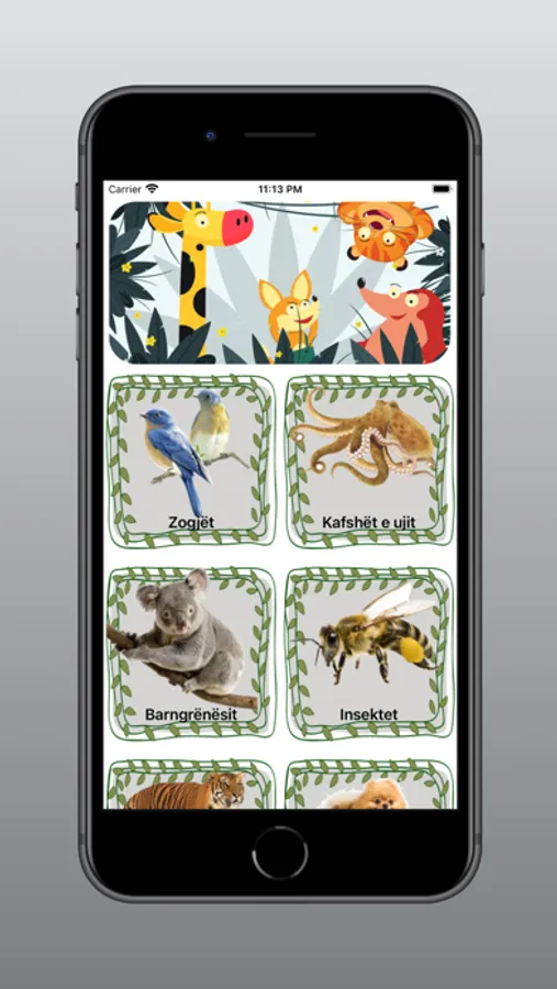 Në këtë aplikacion kafshët dhe shpendët janë të ndara në kategori: