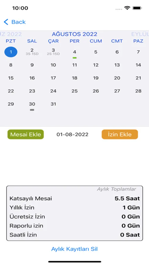 Günlük Fazla Mesai saatlerinizi takvime üzerinde gün seçerek kayıt ederek, aylık toplamları görebilirsiniz. Takvimi sağa-sola sürükleyerek ay değiştirip toplamları görebilirsiniz.