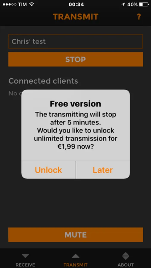 The app as sender will provide you in the free version a 5 minute testing period. If you want to use the stream of audio for longer, you can enable a unlimited audio transmission with an in-app purchase.