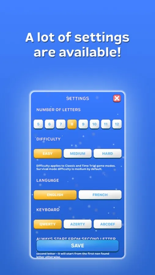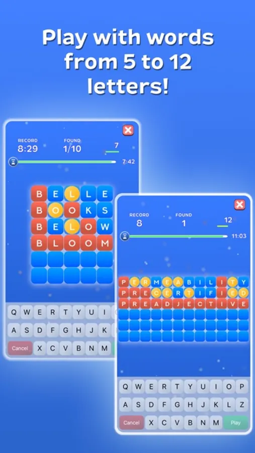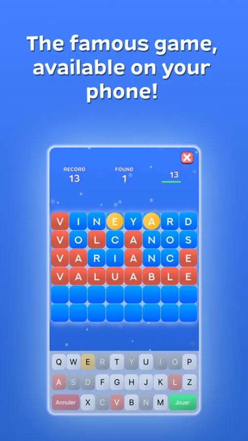 ▪ Play with almost 300.000 English words from 5 to 12 letters! Every existing word is accepted. You can also try the French mode and play with more than 350.000 words from the "language of Molière" (in that case, proper nouns and conjugated verbs are not allowed unless they are present or past participle).