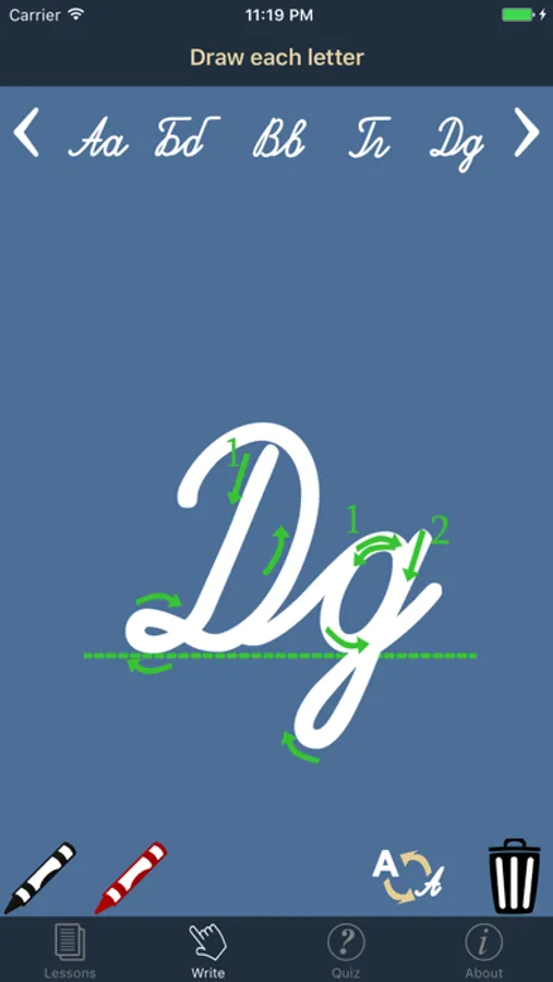 Study the letters in each lesson and write them down several times. Listen first to the letter names, then work on the letter sounds and sample words. Use the Write tab to learn to write letters in both the cursive and print scripts.