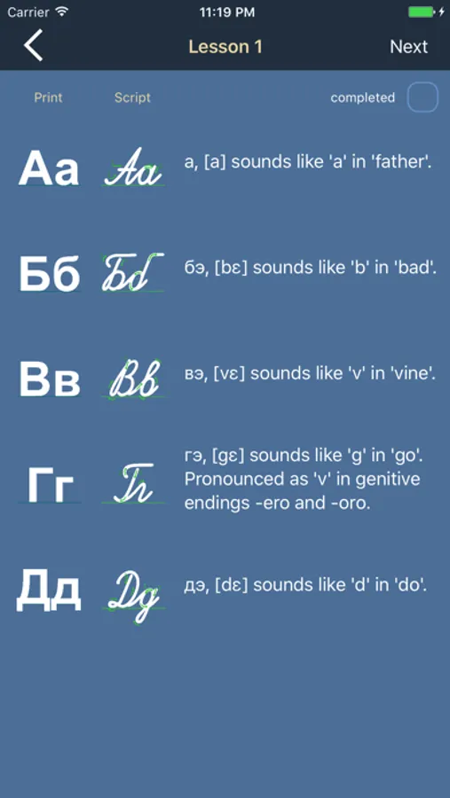 Russian Alphabet Now is a learning tool to help you learn to read and write the Russian Cyrillic alphabet. The entire alphabet is presented in 7 lessons that cover both print and cursive scripts. Includes sound for each letter names, pronunciation and a sample word.