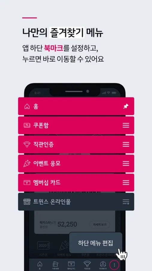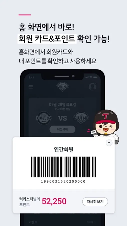 - 첫 화면에서 회원카드와 트윈스포인트를 확인하고 바로 사용