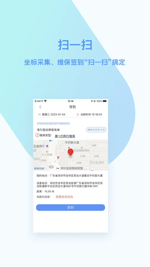 3、扫码签到:扫描使用标志上的二维码即可签到,无需手动输入电梯设备注册代码