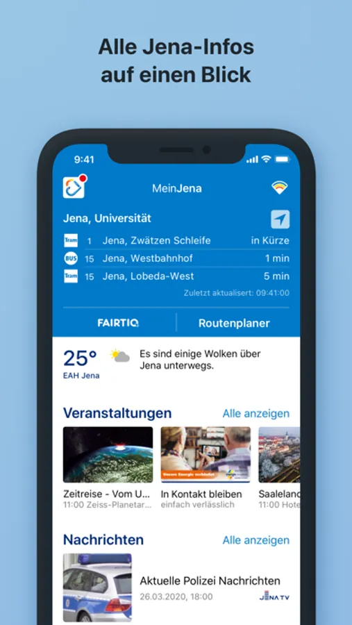 MeinJena app is your everyday companion for Jena. Discover features around mobility, living in Jena, news, events, waste disposal calendar and even more. Extra benefit: access to the free MeinJena WiFi.