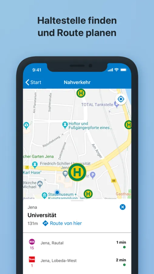 Arrive on time. Every time. Your connections, your trips: With the route planner, not only can you find all bus and tram lines of Jena but also stops from your current position and departure times including delays. Use MeinJena to plan your trips in the entire area of the „Verkehrsverbund Mittelthüringen“ (VMT). Stay informed with the network plans and timetable changes of Jena’s public transport. E-car charging stations: On Google Maps, we show you every electric charging station in Jena with all important information for your electricity tank, such as occupancy, approval, location and of course connector type.