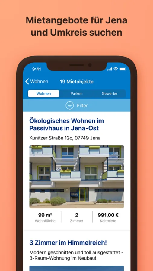 Your new apartment is waiting for you. Find your new apartment, parking spot or commercial space in and around Jena. We always list current apartment offers from various providers in Jena. You can also send us your apartment request directly via the app at any time.