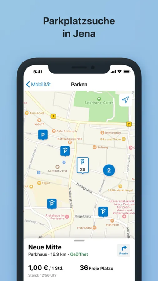 Find instead of search: With the parking space finder in MeinJena you can look stress-free how many free parking spaces there are currently in Jena. All 25 parking spaces and five parking garages in the city of Jena are shown to you (in perspective). There is further information on parking fees, opening times and accessibility of the individual parking spaces.