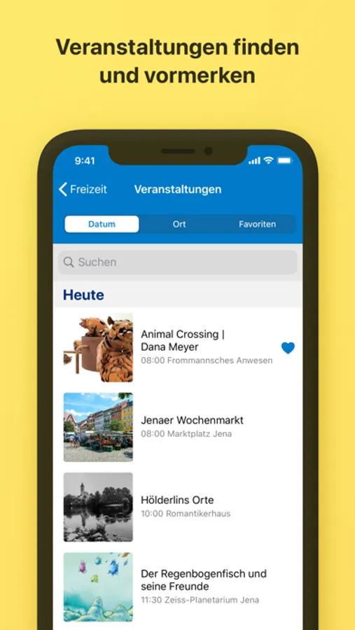 Find events that suit you. You can easily find upcoming concerts, exhibitions, parties, theatre and many more in your MeinJena-App. Whether it is today, tomorrow or any other day - simply load the event calendar via quick access. You can mark your favourites or transfer them directly into your personal calendar. Of course, you can also share exciting events with your friends and acquaintances.