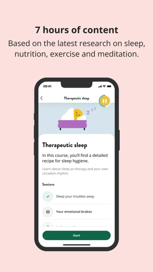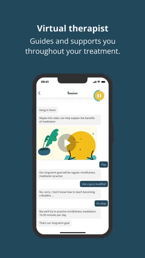 The app can be used on its own and offers a therapy programme with over 50 therapy sessions. The sessions cover a range of topics from behavioural therapy and lifestyle habits, such as, meditation, sleep, diet and exercise. To track changes over time, the app includes the MADRS-s depression test.