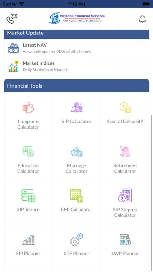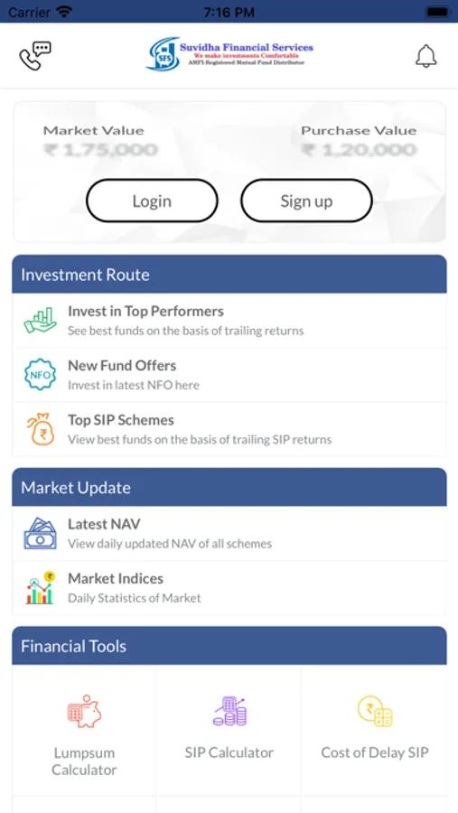 Suvidha-SFC is one-stop shopping for all your investment needs. You can use this state of the art app to stay on top of your Complete Financial Portfolio with all assets: