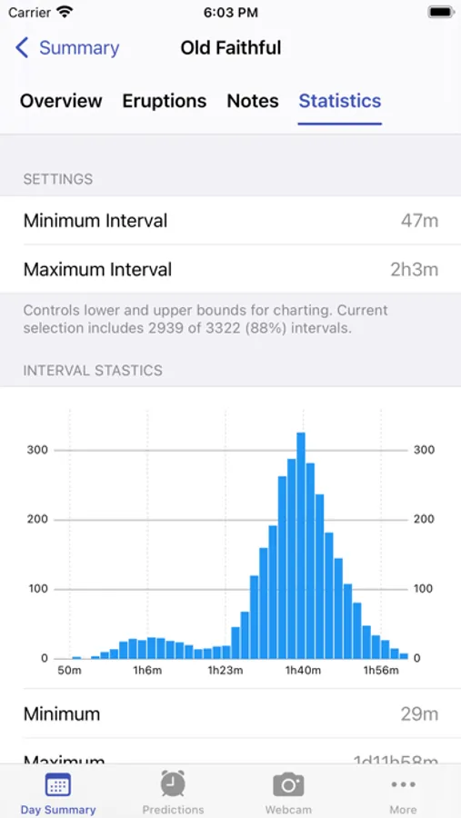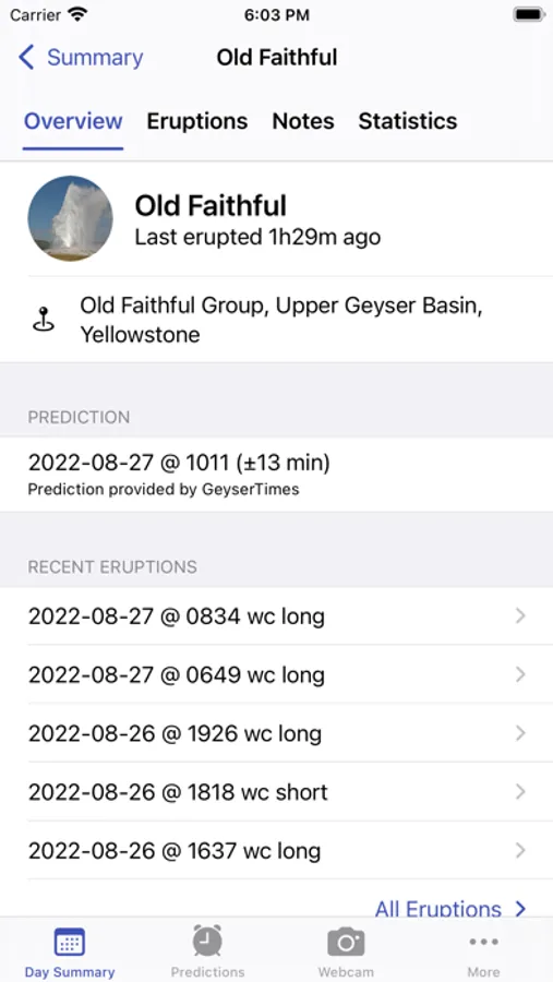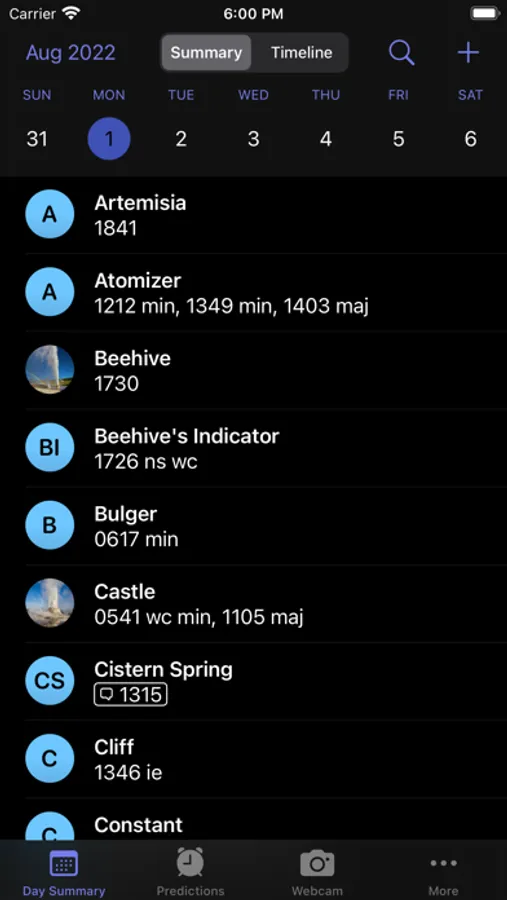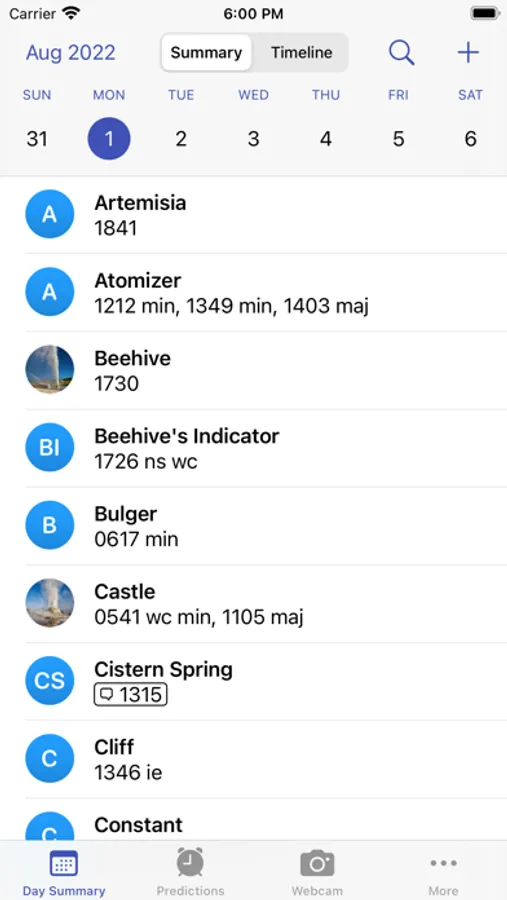 • Explore the daily geyser activity in intuitive summary and timeline modes