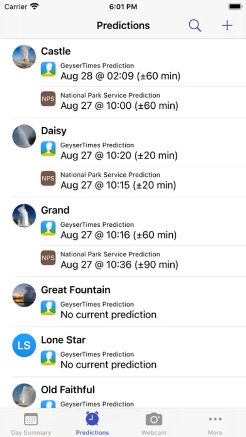 Notes: Synchronization requires a working data connection and should be performed manually before heading out into the basins. Predictions are not 100% accurate as geysers are natural features and the user reports they are based on can be erroneous.