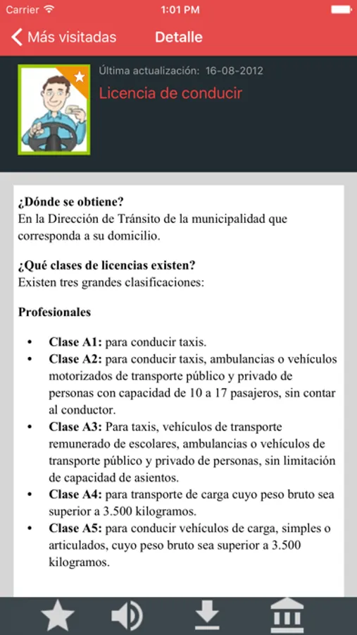 En el detalle de cada ley fácil, la aplicación muestra el título, fecha de última actualización, descripción, y detalle. A su vez si la ley fácil lo dispone, entregará accesos a una guía pdf, un audio, y enlaces a las leyes oficiales relacionadas.