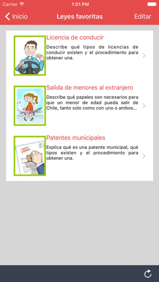 Leyes Favoritas: corresponde a las leyes fáciles que han sido visitadas en su detalle desde la “Búsqueda”, “Los más buscado” o “Ultimas 4 leyes”, y han sido marcadas como favoritas. Esta lista de leyes fáciles es accesible con o sin conexión a internet.