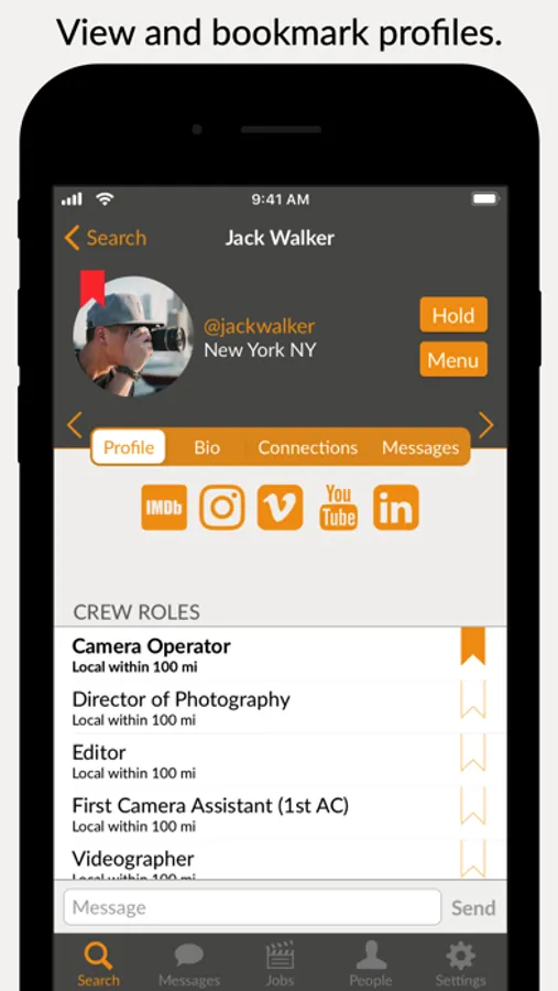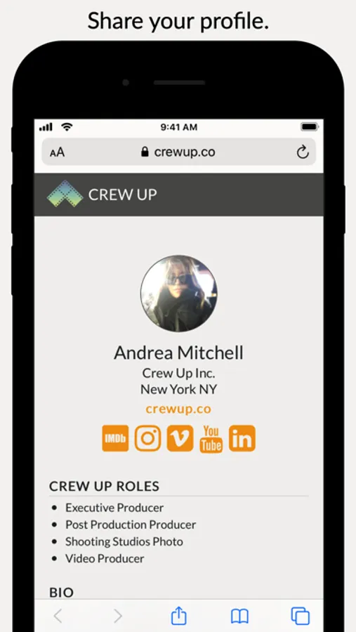 Create a profile to showcase your skills and services, including a bio and links to IMDb, Instagram, Vimeo, YouTube, LinkedIn and your site.