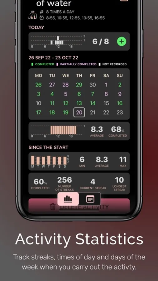 With Habit Tracker, you will be able to set your goals, choose the frequency and start tracking which days you complete each goal. You can set the number of times a day, week or month you want to complete the activity.