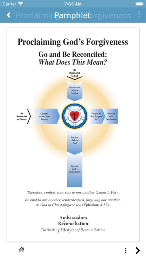 This study reviews biblical reconciliation. Each of the six lessons include a biblical review of one part of the cross diagram along with key questions with biblical references for finding answers. Each lesson also includes a case study for application. The application questions of each lesson are included in this app because they are also useful for self-reflection as we apply scripture to our daily lives.