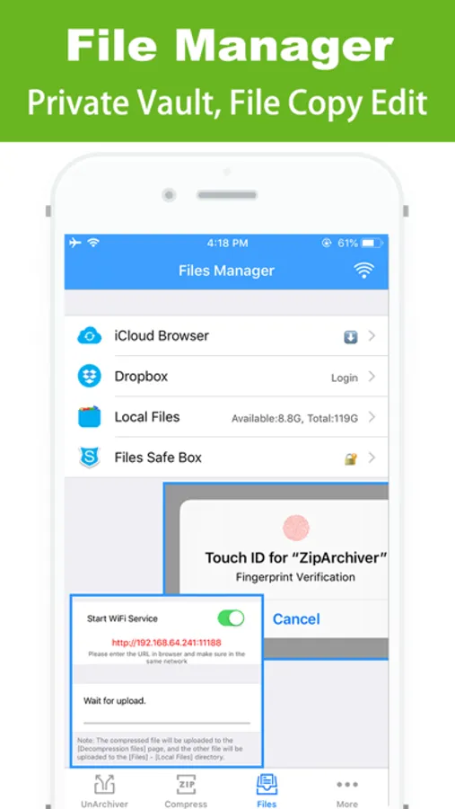 After decompression of the privacy file can be copied to the file safe box, file safe box support touchid and gesture dual certification, protection of privacy does not leak. Mobile phone privacy photos, video can also be easily imported.