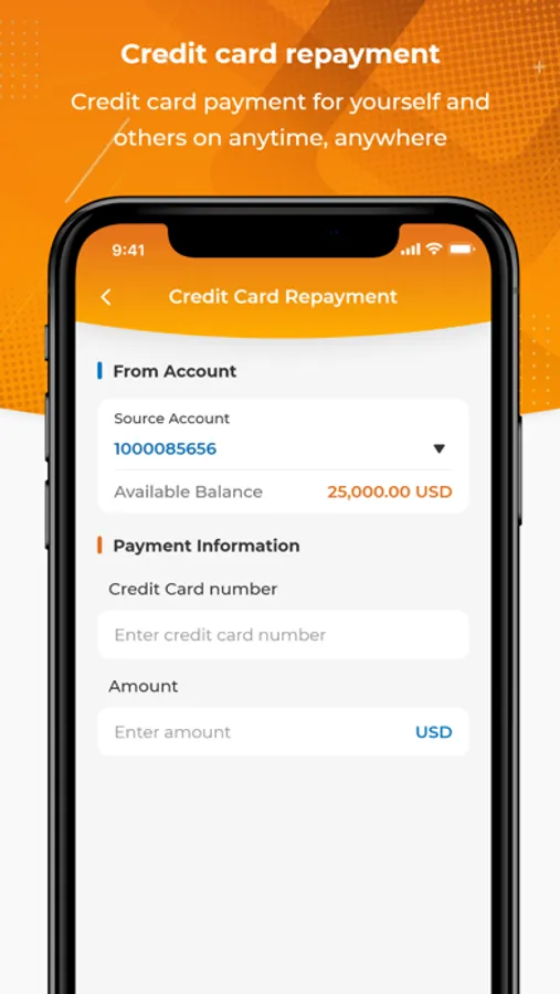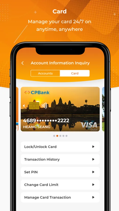 • Card: your card is securely with many protect functions such as Lock/Unlock card, check your credit card information, mini statement, and transaction history, set security PIN, change card limit, and manage card transaction