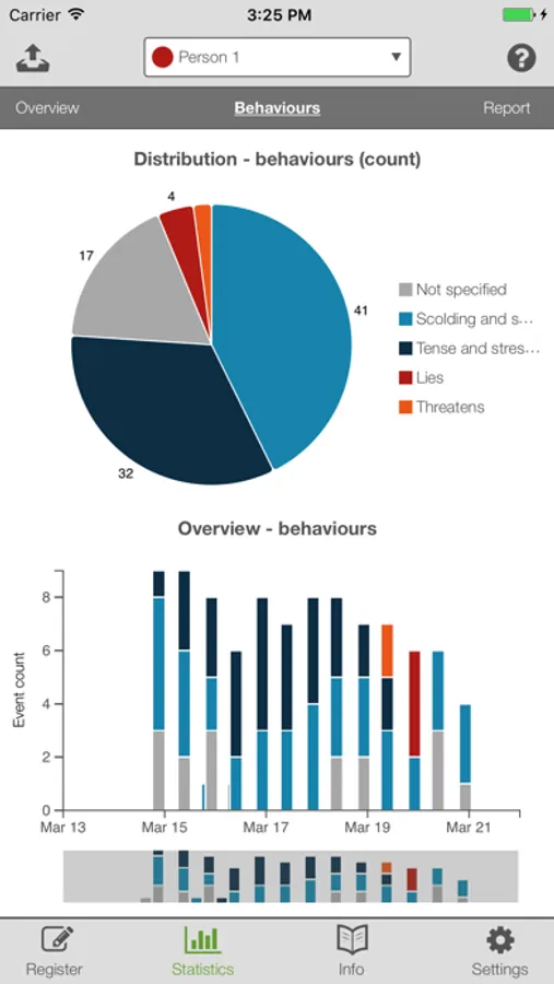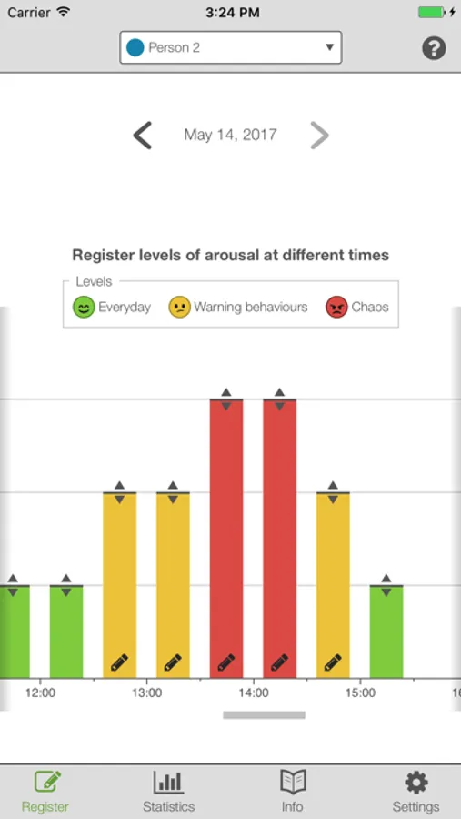 This is a tool that facilitates tracking of severe behaviours of concern and outbursts that disrupt daily life. Warning behaviours, which are a bit lower in their level of arousal, but still signal that everything is not going smooth, may also be tracked using the app. After a period of use, it will be possible to see if there are days or times of the day where outbreaks and chaos are recurring. If you make changes in everyday routines or in response to a conflict situation, you can, after some time, find out if the changes have had an effect on the amount of outbursts.